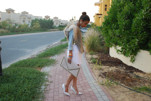 Shirt and fur trim by H&M, Skirt & shoes by Zara, Belt by Gucci, Clutch by Nine West,