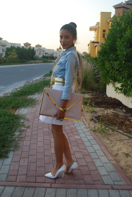 Shirt and fur trim by H&M, Skirt & shoes by Zara, Belt by Gucci, Clutch by Nine West,