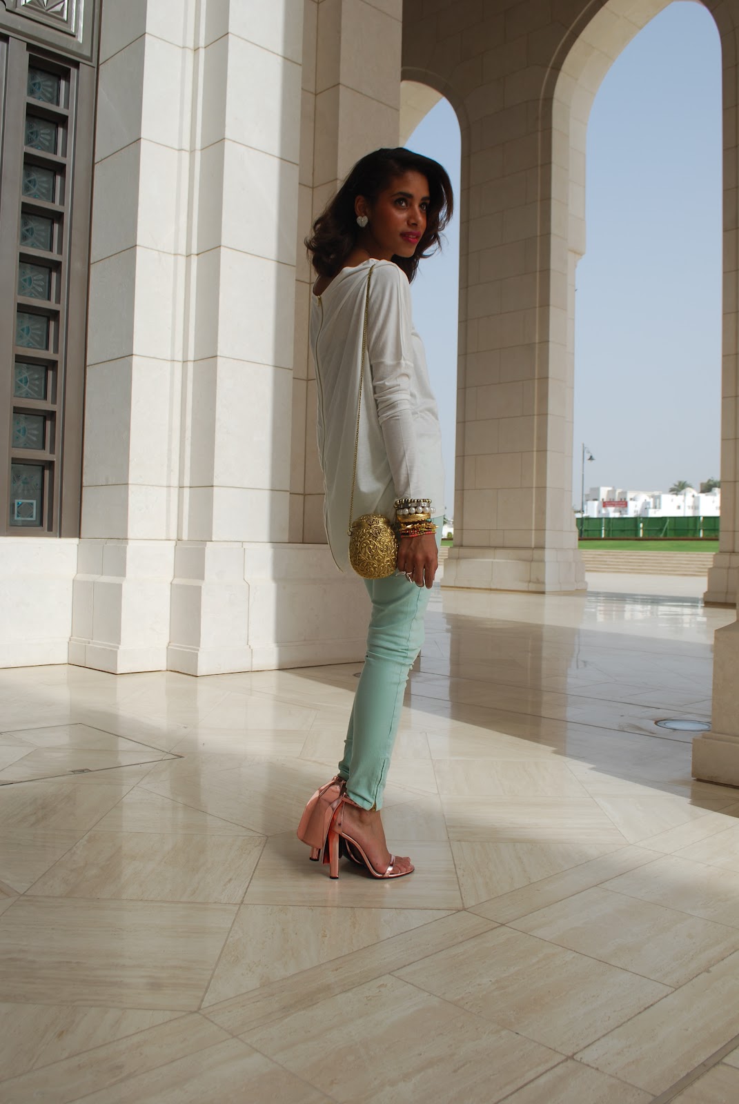 Hey All, So As you guys can tell I am obsessed with pastel colors and I was requested to do more posts with colored jeans! mint is on the top of my list when it comes to this seasons color pallet! I absolutely love it.. These pictures were taken on my weekend away in muscat, It was at the Opera House.. absolutely amazing place Love the building and details… hope you love the outfit!