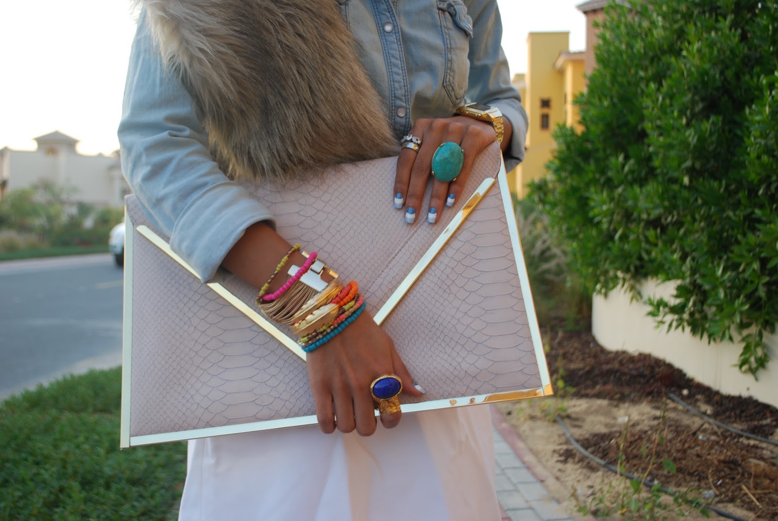 Shirt and fur trim by H&M, Skirt & shoes by Zara, Belt by Gucci, Clutch by Nine West,