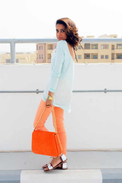 Last week I was requested by a reader to do an outfit post on how to style colored jeans. Well here is one outfit and many more to come. my choice of styling this coral pastel jeans with a minty top was just a way of showing you that its ok to color block! as this coming season is all about pastel and just a bit of color blocking and of course adding my MARNI at H&M necklace and gladiator sandals.